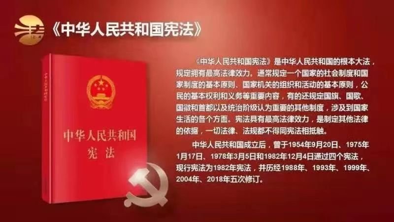 自中華人民共和國成立后,曾于1954年9月20日、1975年1月17日、1978年3月5日和1982年12月4日通過四個憲法,現行憲法為1982年憲法,并歷經1988年、1993年、1999年、2004年、2018年五次修訂。在2014年11月1日召開的十二屆全國人大常委會第十一次會議經表決通過了全國人大常委會關于設立國家憲法日的決定,設立每年12月4日為國家憲法日,因此2014年12月4日即中國首個國家憲法日。