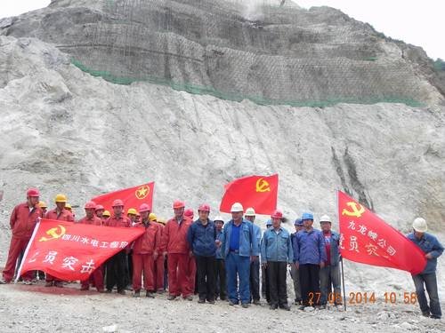 儀式莊嚴(yán)、肅穆。九龍公司董事長(zhǎng)楊利民發(fā)表了熱情洋溢的講話(huà)。工程局九龍峽電站樞紐工程項(xiàng)目經(jīng)理陳道剛代表項(xiàng)目部莊嚴(yán)承諾:面對(duì)困難和挑戰(zhàn),我們將高高舉起“黨員先鋒隊(duì)”的旗幟,以沖天的干勁、滿(mǎn)腔的熱情和忘我的工作精神,在急、難、險(xiǎn)、重等工作中身先士卒,發(fā)揮好共產(chǎn)黨員的先鋒模范作用;以標(biāo)桿引航的作用凝聚全體員工的力量,匯聚成推動(dòng)工程建設(shè)的強(qiáng)大洪流,攻堅(jiān)克難,勇往直前。我們將繼續(xù)發(fā)揚(yáng)特別能吃苦、特別能戰(zhàn)斗、特別能奉獻(xiàn)的“水利鐵軍”精神,克服施工條件惡劣、生活環(huán)境艱苦等困難,與時(shí)間賽跑,與極限挑戰(zhàn),用激情和汗水為工程建設(shè)寫(xiě)上濃墨重彩的一筆,用實(shí)際行動(dòng)向建黨93周年獻(xiàn)禮!