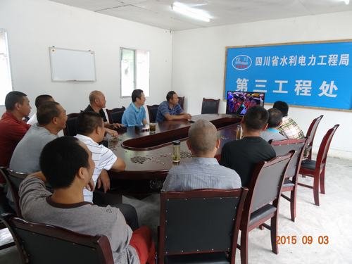 2015年9月3日上午,三處處長李軍帶領三處領導班子、處各科室主要負責人,在后溝水庫項目部會議室組織職工觀看紀念中國人民抗日戰爭暨世界反法西斯戰爭勝利70周年紀念大會電視直播。