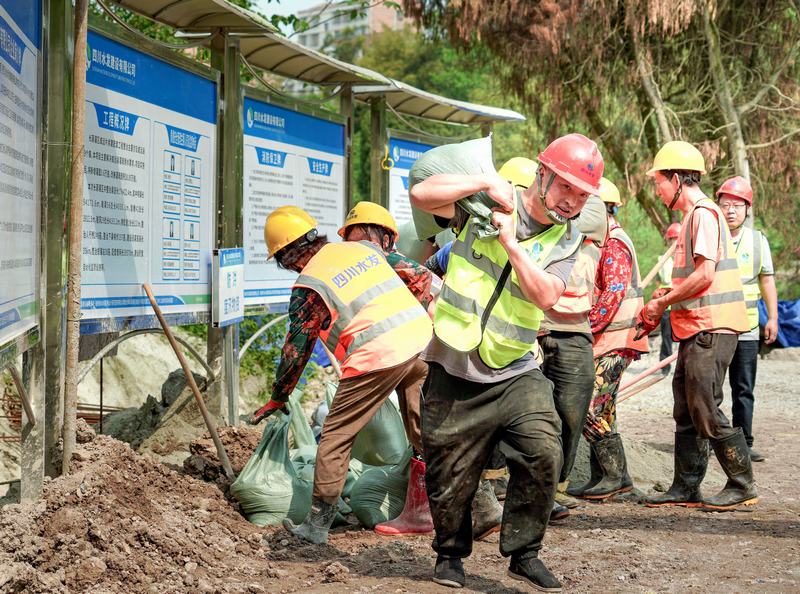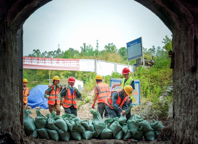 本次演練模擬威遠(yuǎn)縣境內(nèi)遭遇強(qiáng)降雨天氣,降雨量在短時(shí)間急劇上漲,渠道上游來水即將漫入冒殼山隧洞施工現(xiàn)場(chǎng),面對(duì)這一“突發(fā)狀況”,項(xiàng)目部立即啟動(dòng)應(yīng)急預(yù)案,各小組迅速響應(yīng),分工明確,有條不紊地開展搶險(xiǎn)工作。在搶險(xiǎn)過程中,搶險(xiǎn)人員緊密配合,將裝滿粘土的沙袋依次堆疊,對(duì)隧洞口進(jìn)行封堵;經(jīng)過爭(zhēng)分奪秒的奮戰(zhàn),隧洞口成功完成搶險(xiǎn)封堵,應(yīng)急處置任務(wù)圓滿結(jié)束。